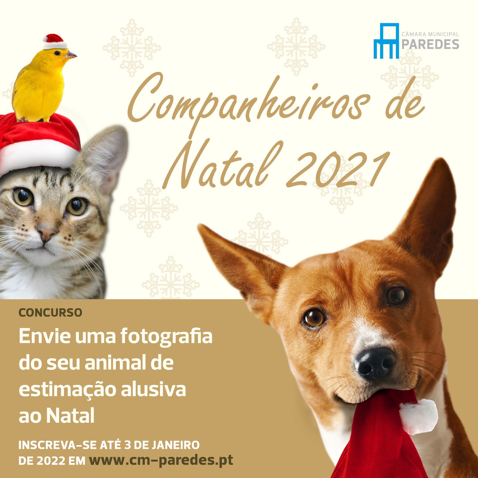Neste Natal, o Município de Paredes apresenta o Concurso “Companheiro de Natal 2021”. Este concurso é dirigido aos detentores de animais de companhia residentes no concelho de Paredes e aos adotantes de animais do Centro de Recolha de Canídeos de Paredes.